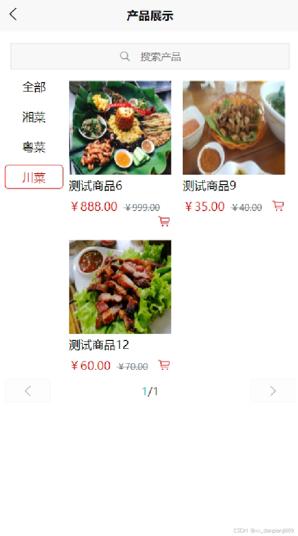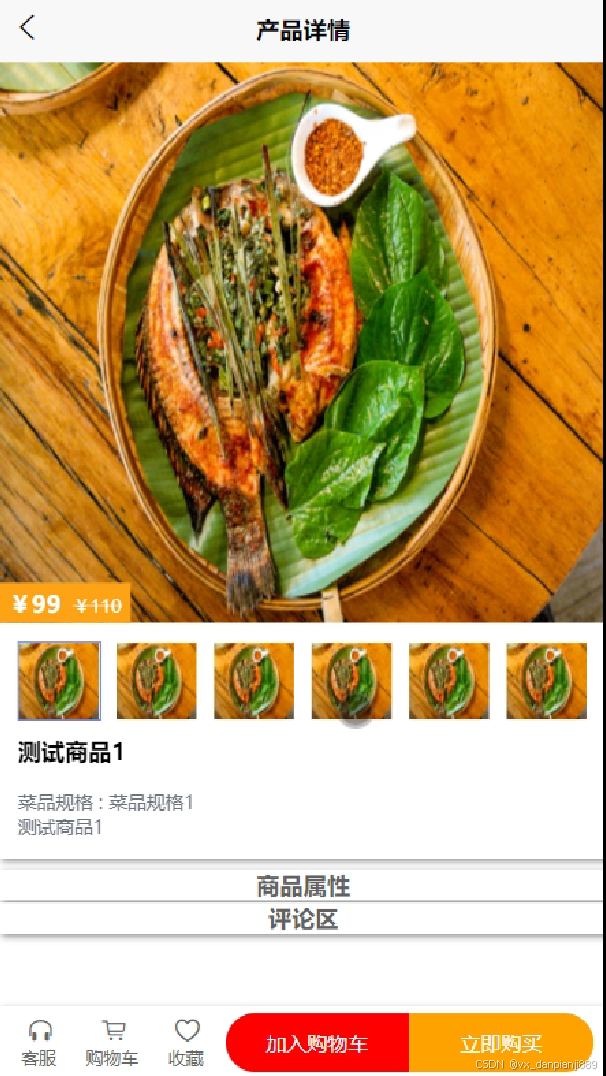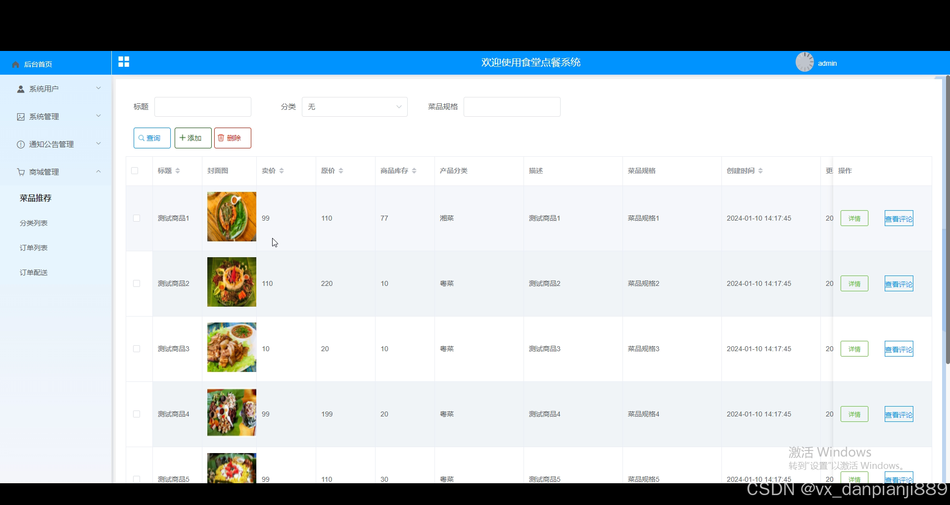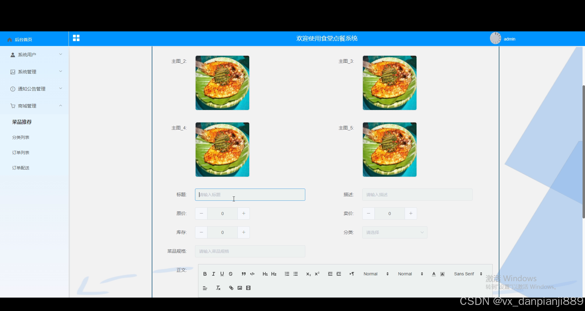 通过商城管理页面,管理员管理、维护、添加商品信息,添加新的商品需要填写包括标题、封面图、卖价、原价、商品库存、产品分类、描述、菜品规格、正文等信息,菜品信息管理界面如下图所示。