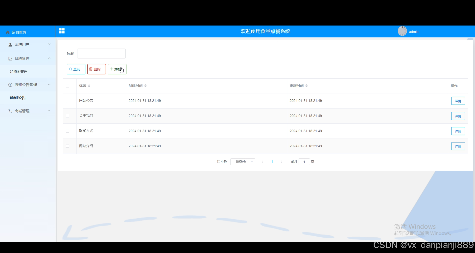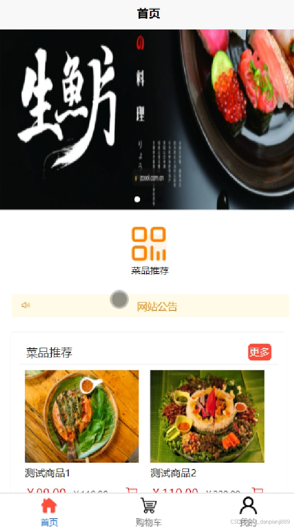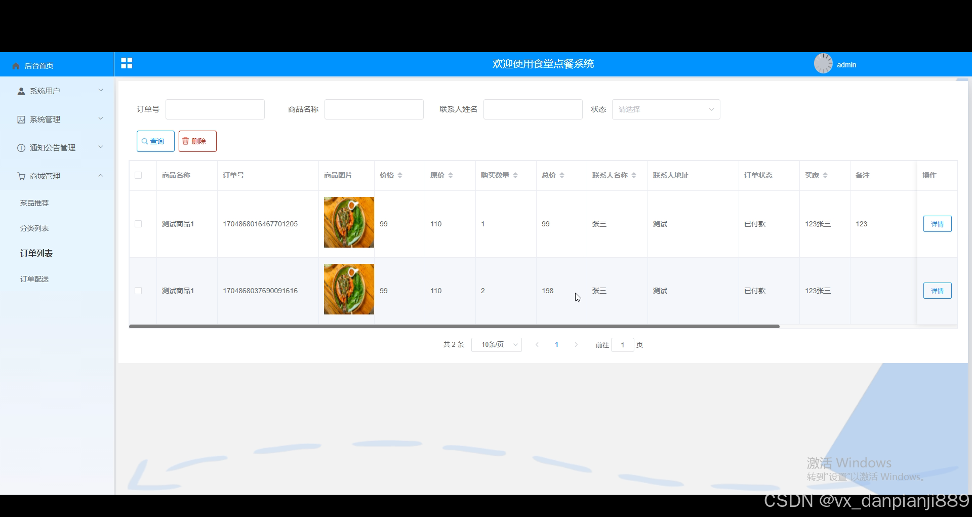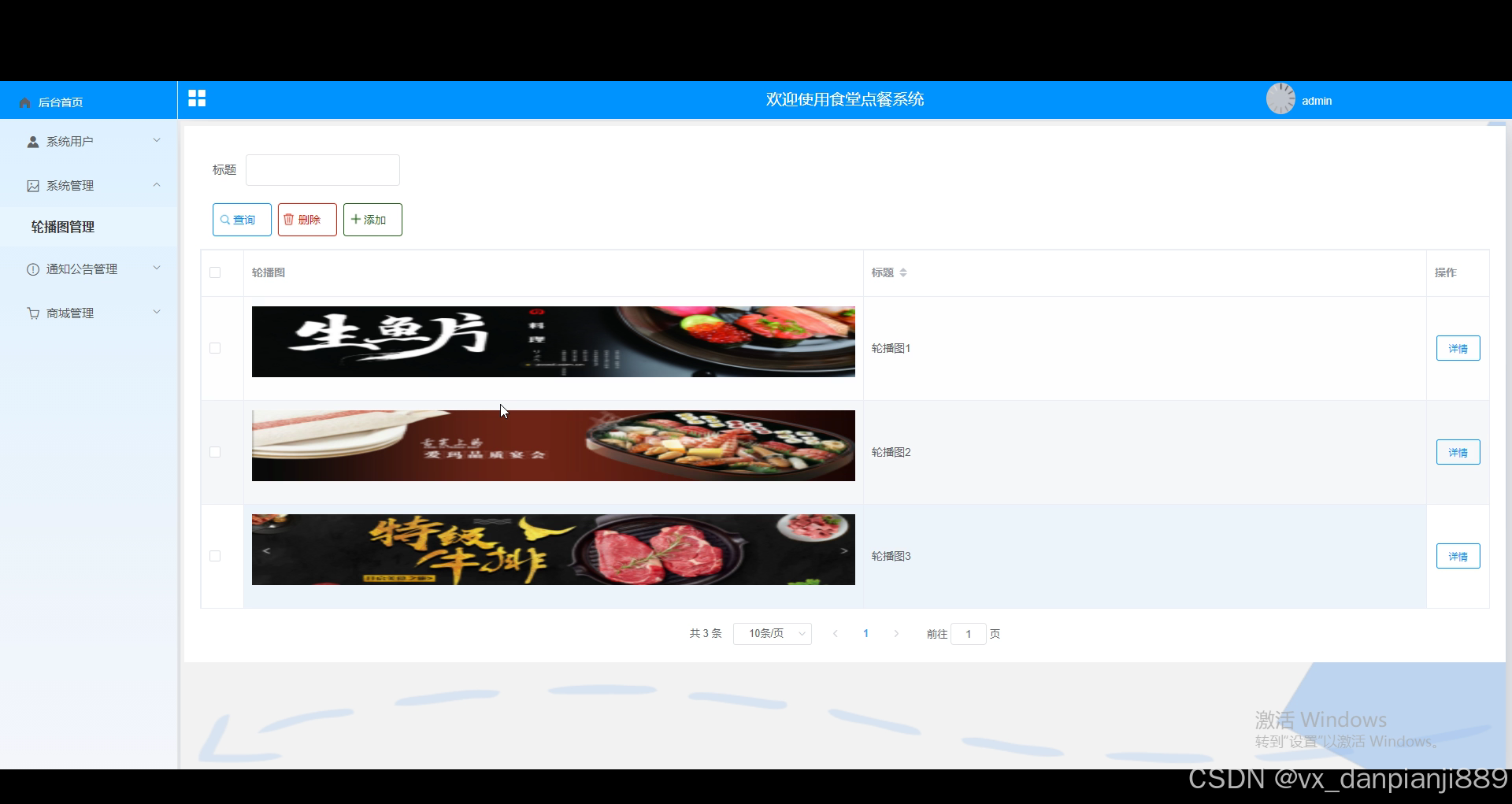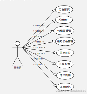 通过管理员功能页面,管理员可以查看后台首页(商品销售金额统计、商品销售数量统计)、系统用户(管理员、系统用户)、轮播图管理、通知公告管理、商城管理(菜品推荐、分类列表、订单列表、订单配送)等,并且可以根据需要进行相应的操作,界面如下图所示。