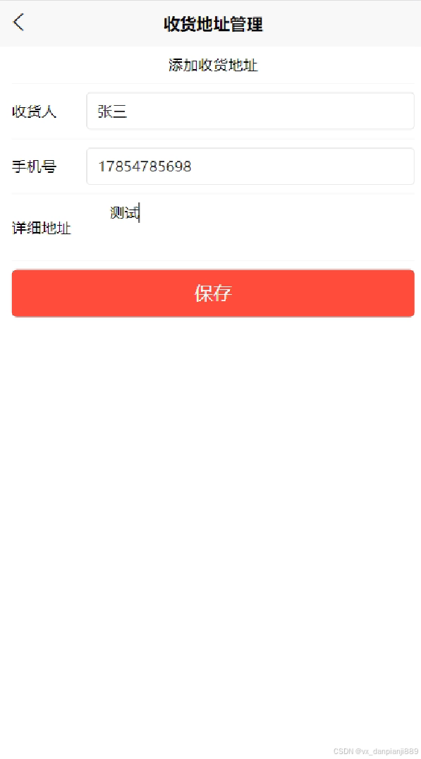 当用户点击食堂点菜系统中“我的”,可以看到我的(基本信息、收货地址、收藏、订单、订单配送),进入收货地址详细界面,在详情页面填写用户信息、收货人、收获地址、收货电话等详情信息、进行收货地址添加操作。界面如下图所示。