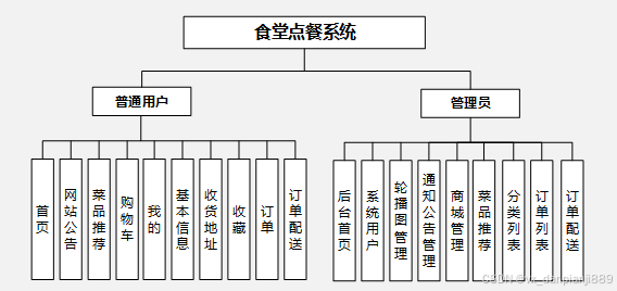 通过微信小程序开发的食堂点菜系统,不仅支持用户的登录,还支持对用户信息、商品信息、网站公告、菜品推荐等的查看,并且提交全面的数据和信息,从而满足用户的交易需求。此外,该软件还支持查看订单、配送信息等,为用户带来更为便利的操作体验,并且通过对用户的人性化反馈,为用户带来更为全面的服务体验。根据系统功能需求建立的模块关系图如下图: