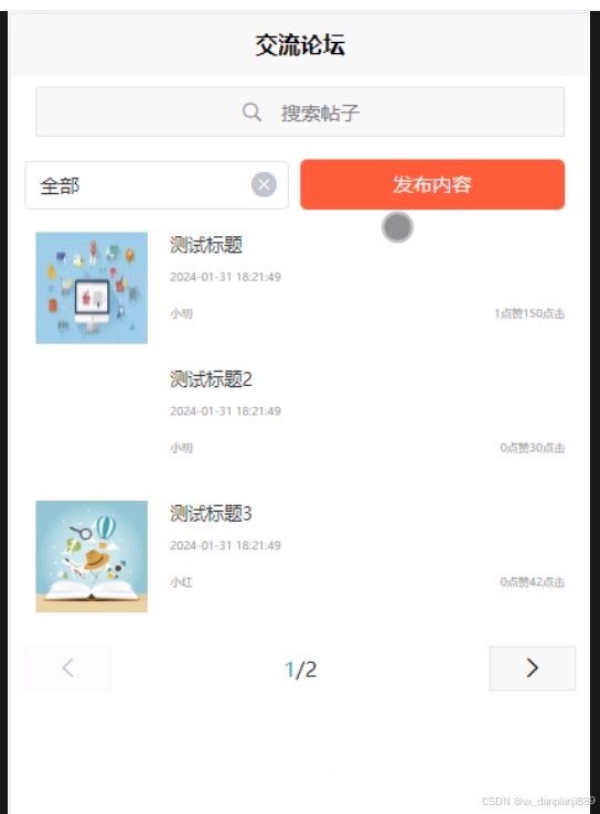 - 交流论坛:用户可以发布论坛内容,可以查看论坛列表中某个论坛的详情并可以点赞、收藏和评论。