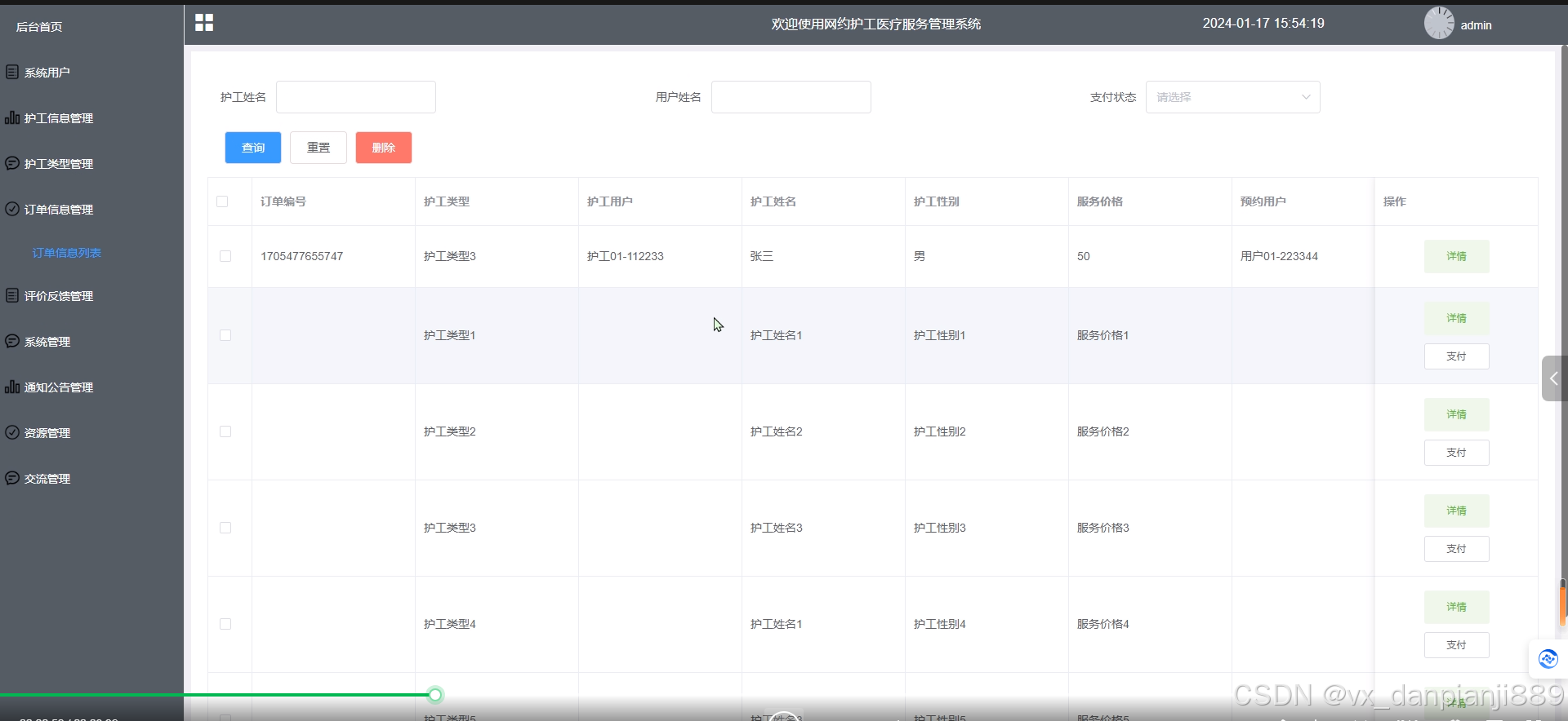 管理员可以查看订单信息列表中某个用户的订单详情,已支付的订单可以查看支付详情,可以对订单信息进行查询、重置和删除操作。其界面如下图4-11所示。