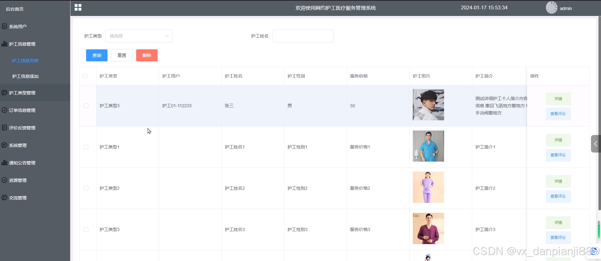 - 护工信息管理:管理员可以查看护工信息列表中某个护工的详情和评论,可以对护工信息进行增删改查操作。