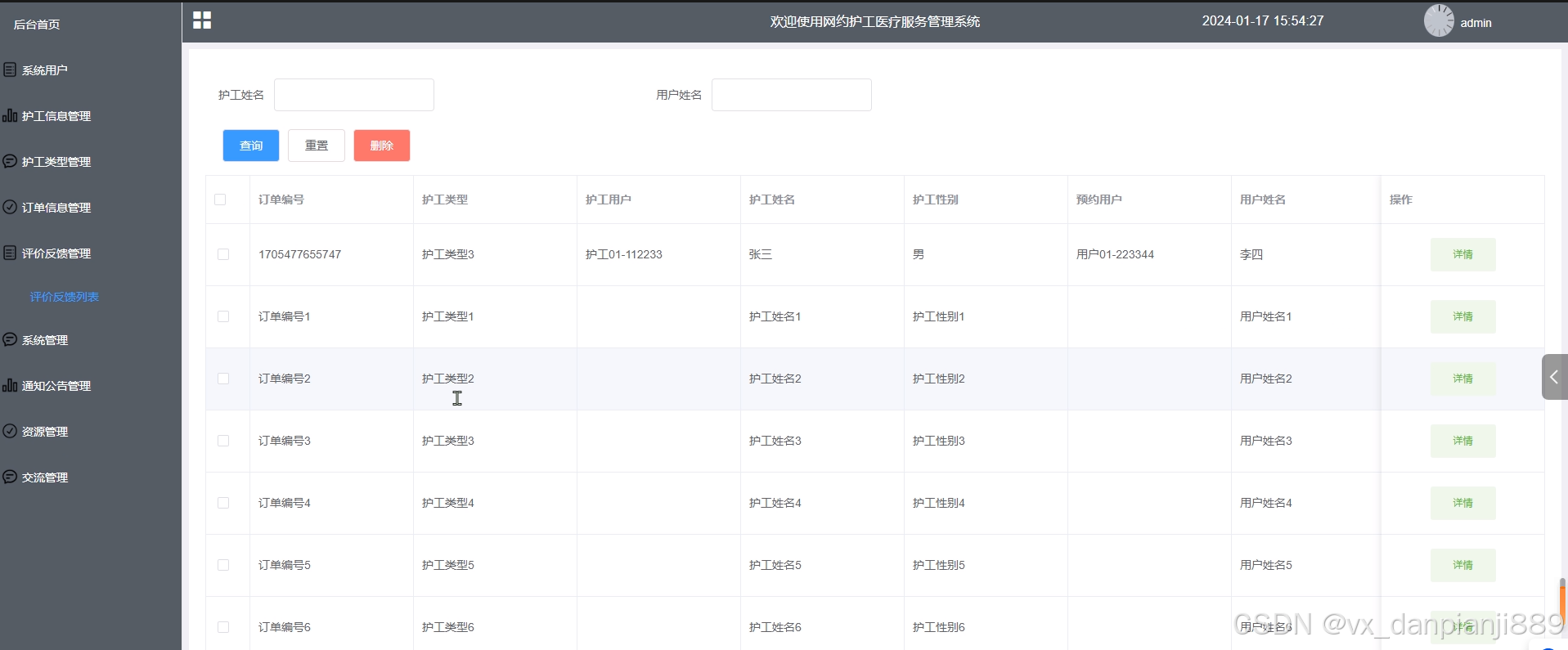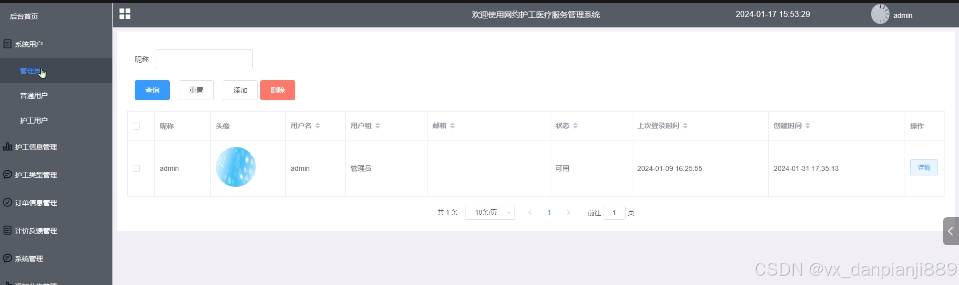 - 系统用户:管理员可以查看系统用户(管理员、护工用户、普通用户)列表中某个用户的详情,可以对用户信息进行增删改查操作。