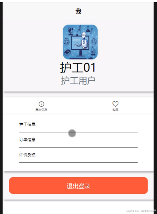 - 我的:用户点击首页右下角“我的”进入页面可以查看和管理基本信息、护工信息、订单信息、评价反馈和收藏信息;点击“退出登录”即可退出系统登录。