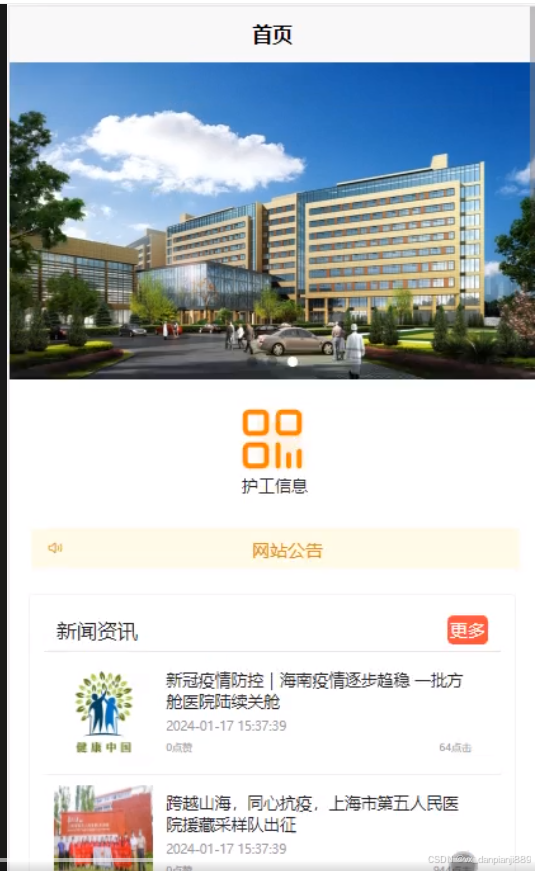 - 首页:用户可以查看首页展示的轮播图、通知公告、新闻资讯、护工信息等信息。