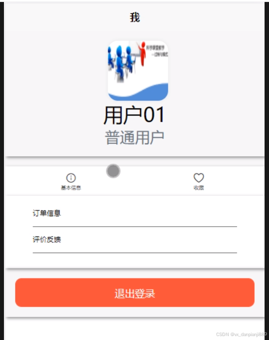 - 我的:用户点击首页右下角“我的”进入页面可以查看和管理基本信息、订单信息、评价反馈和收藏信息;点击“退出登录”即可退出系统登录。
