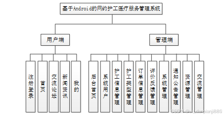 按照基于Android的网约护工医疗服务管理系统的功能模块,主要包括用户端(护工用户、普通用户)和管理端(管理员)这两大功能模块。
