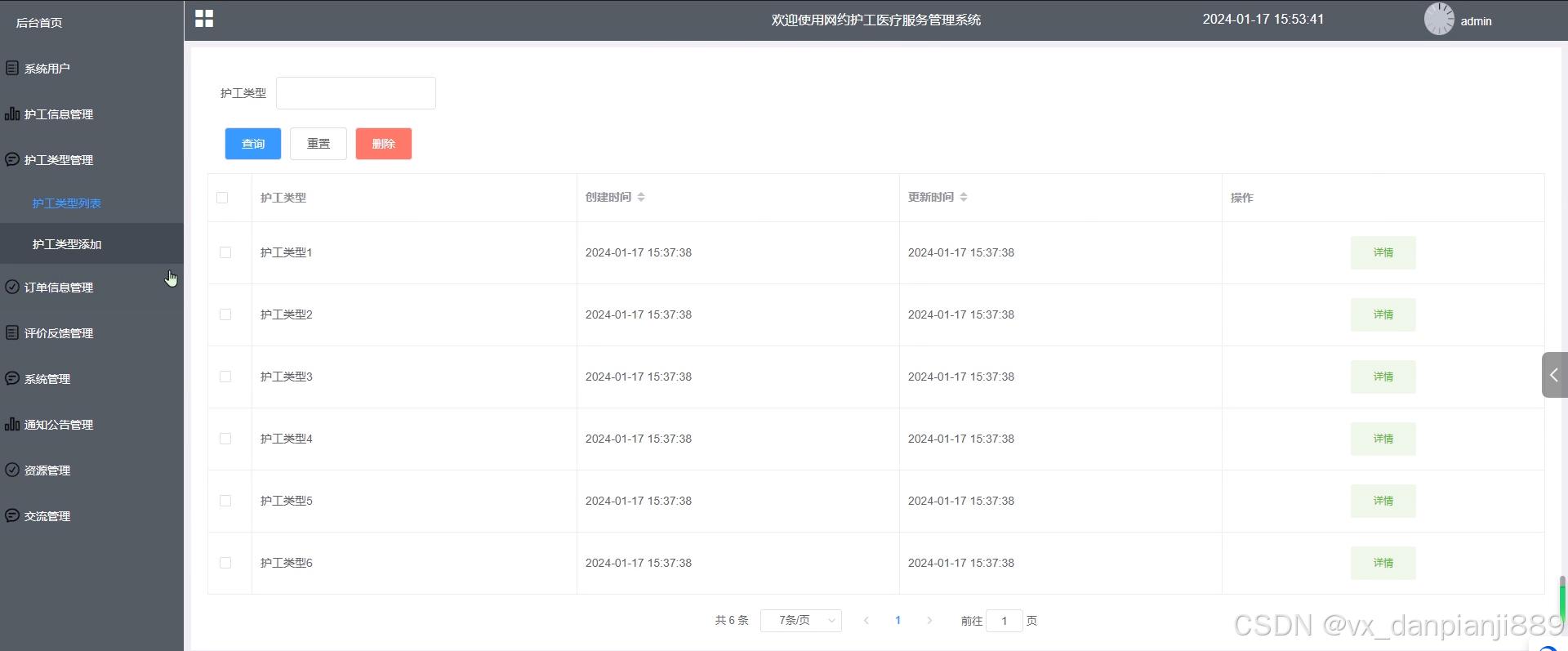 管理员可以添加护工类型信息,可以查看护工类型列表中某个类型的详情;可以对护工类型列表进行查询、重置和删除操作。其界面如下图4-10所示。