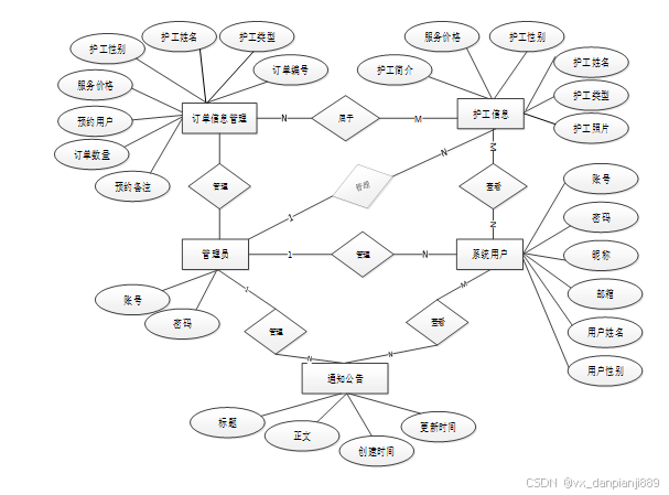 下面是整个基于Android的网约护工医疗服务管理系统中主要的数据库表总E-R实体关系图。