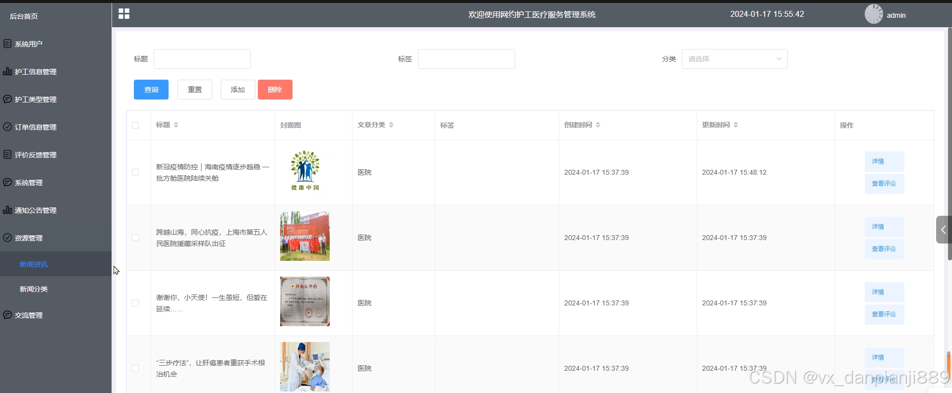 - 资源管理:管理员在“资源管理”这一菜单下对新闻资讯和新闻分类进行管控,可以对新闻资讯、新闻分类信息进行增删改查操作。