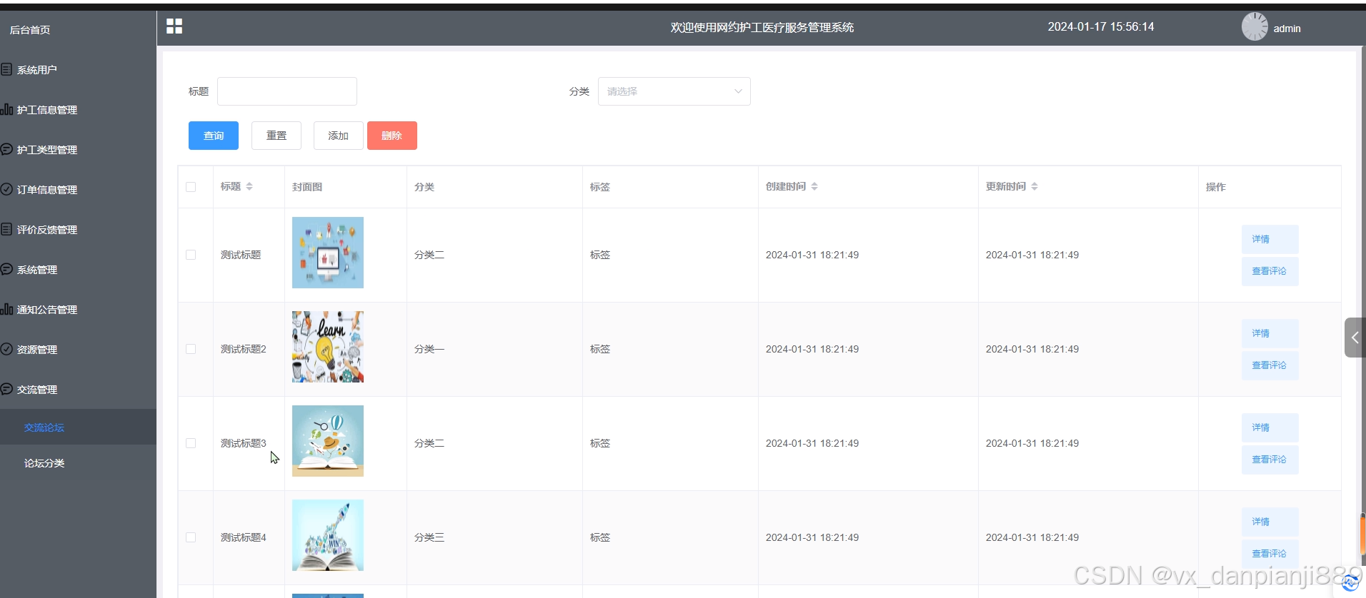 - 交流管理:管理人员在“交流管理”这一菜单下对交流论坛和论坛分类进行管控,可以对交流论坛、论坛分类信息进行增删改查操作。
