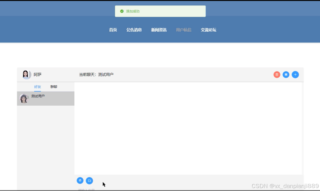 用户私信:用户可以添加论坛账户用户进行私信聊天。如图4-10所示。
