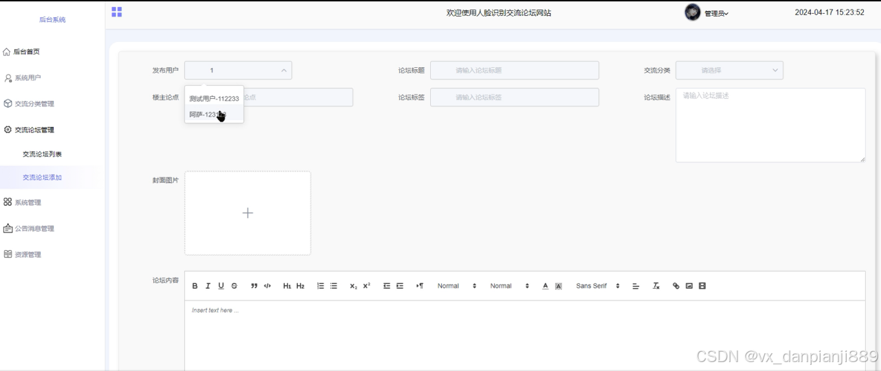 - 交流论坛管理:管理员可以查看交流论坛列表,包括添加、修改、删除论坛信息,包括论坛标题、交流分类、论坛标签、论坛描述、论坛内容、封面图片等。