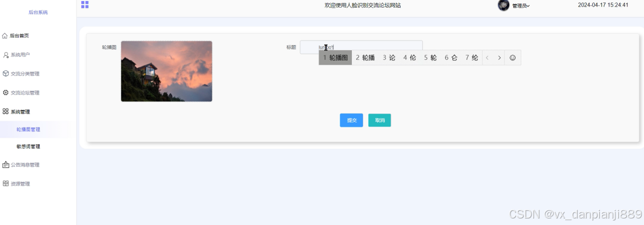 登录系统管理界面:可以插入轮播图图片、填写标题进行提交,如图4-12所示。