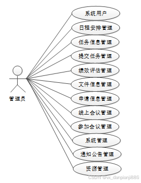 管理员进入系统后主要实现对员工用户和部门经理的注册账号添加,和对日程安排管理、任务信息管理、提交任务管理、绩效评估管理、文件信息管理、申请信息管理、线上会议管理、参加会议管理、系统管理、通知公告管理、资源管理等主要模块的信息处理工作。