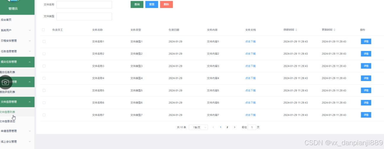 文件信息管理:管理员可以查看文件信息列表,可以对某一文件信息查看详情,也可添加新的文件信息。界面如下图所示。