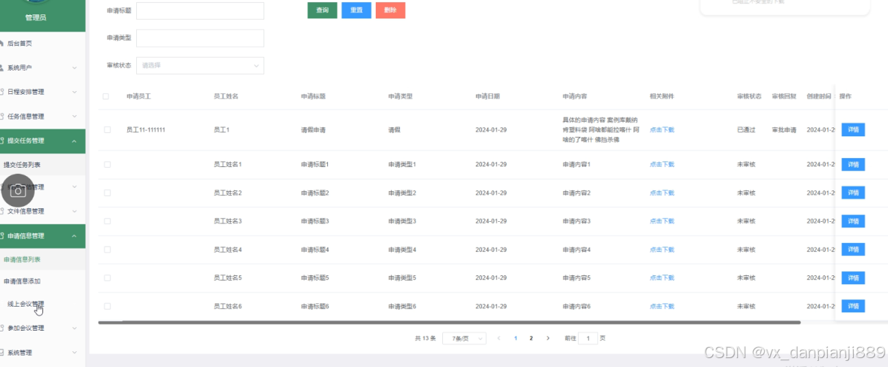 该系统功能涵盖了系统用户、日程安排管理、任务信息管理、提交任务管理、绩效评估管理、文件信息管理、申请信息管理、线上会议管理、参加会议管理、系统管理、通知公告管理、等等核心模块,全面满足企业的日常办公需求。通过采用面向对象的开发模式,确保了系统的灵活性和可维护性。同时,系统的技术实现注重稳定性和安全性,采用springboot框架和MySQL数据库,保证了数据的存储和访问效率,确保了系统的稳定运行和数据安全。