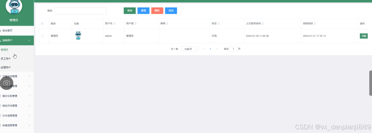 系统用户管理:管理员负责管理系统的用户,包括管理员、员工用户和部门经理的登录、权限分配等操作。他们可以添加、编辑、删除或审核用户账户,并设定相应的权限。界面如下图所示。