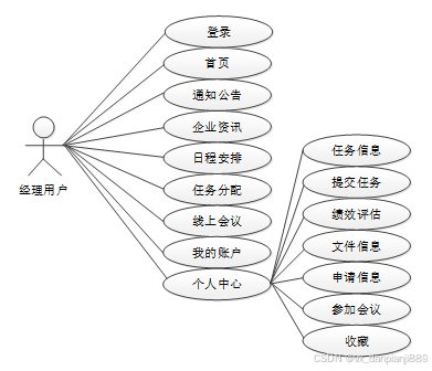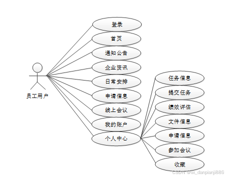 员工用户账号由管理员在后台直接添加。进入系统后主要实现通知公告、企业资讯、日常安排、申请信息、线上会议、我的账户(修改资料+修改密码)、个人中心(任务信息+提交任务+绩效评估+文件信息+申请信息+参加会议+收藏)等功能进行查看或者管理。图2-1就是员工用户角色的用例展示。