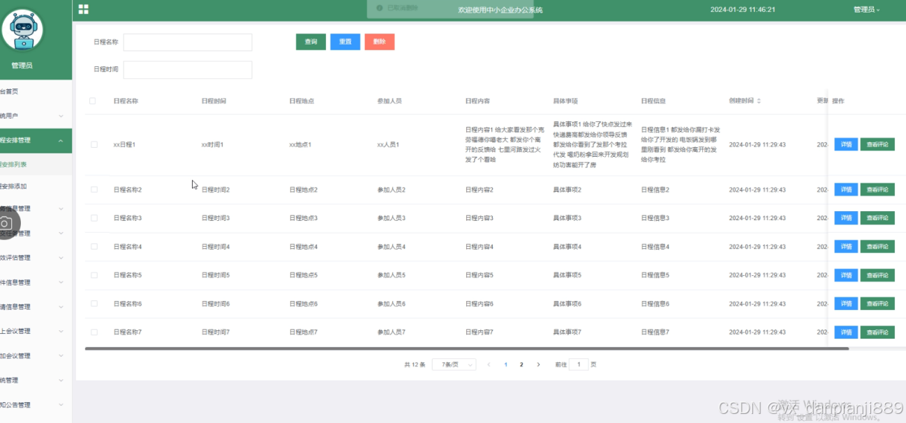 日程安排管理:管理员可以查看日程安排列表,可以对某一日程安排查看详情以及其他用户的评论内容,也可添加新的日程安排。界面如下图所示。