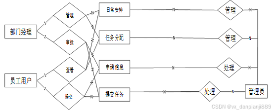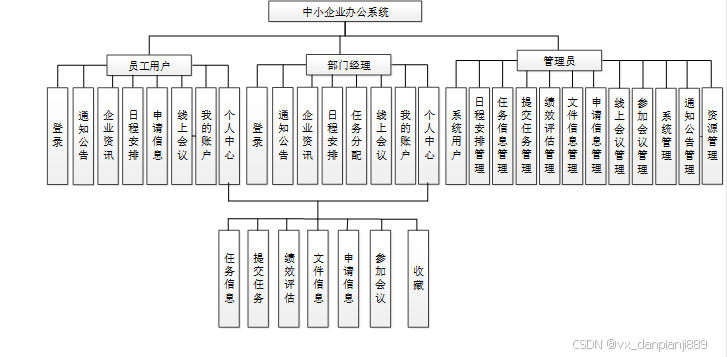 中小企业办公系统包含员工用户模块、经理模块和管理员模块三个角色划分,三大角色主要功能如下: