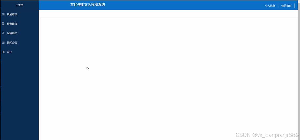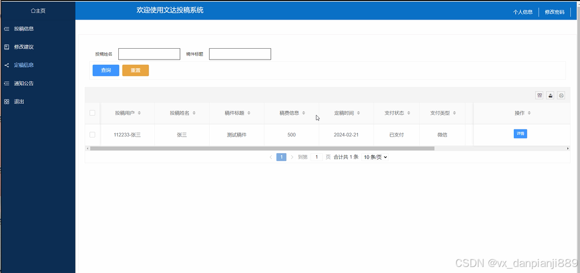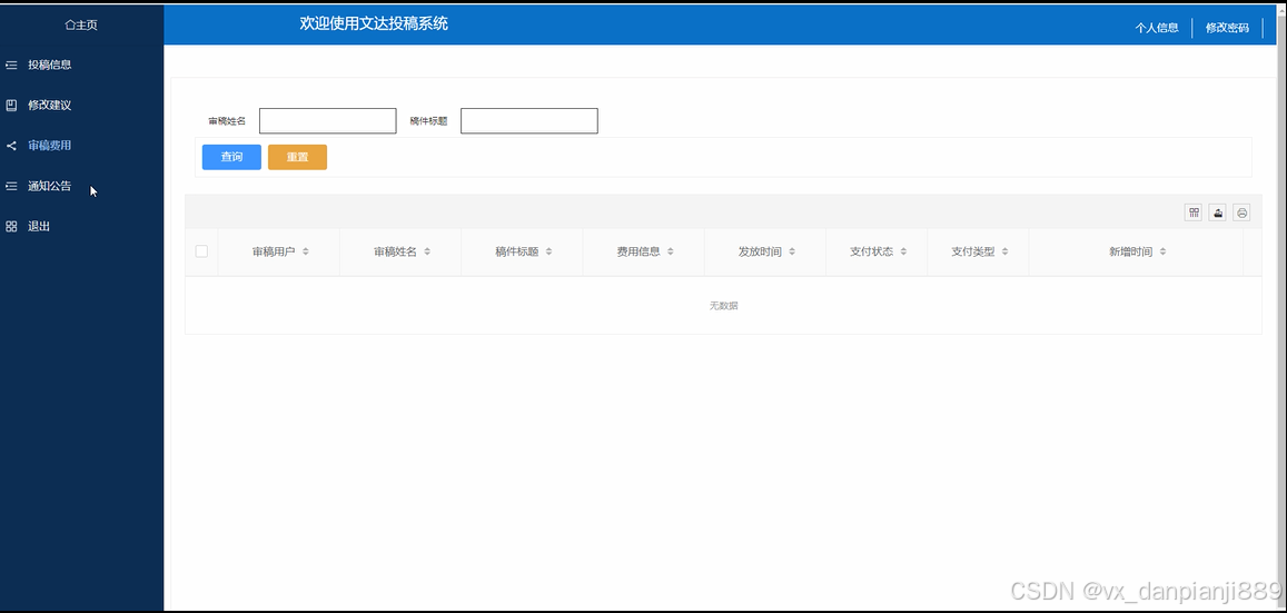 通过对文达投稿系统的设计与实现,我们验证了该系统的可行性和有效性。它为投稿人和审稿人员提供了一个高效的投稿平台,促进了学术交流和论文出版的顺利进行。