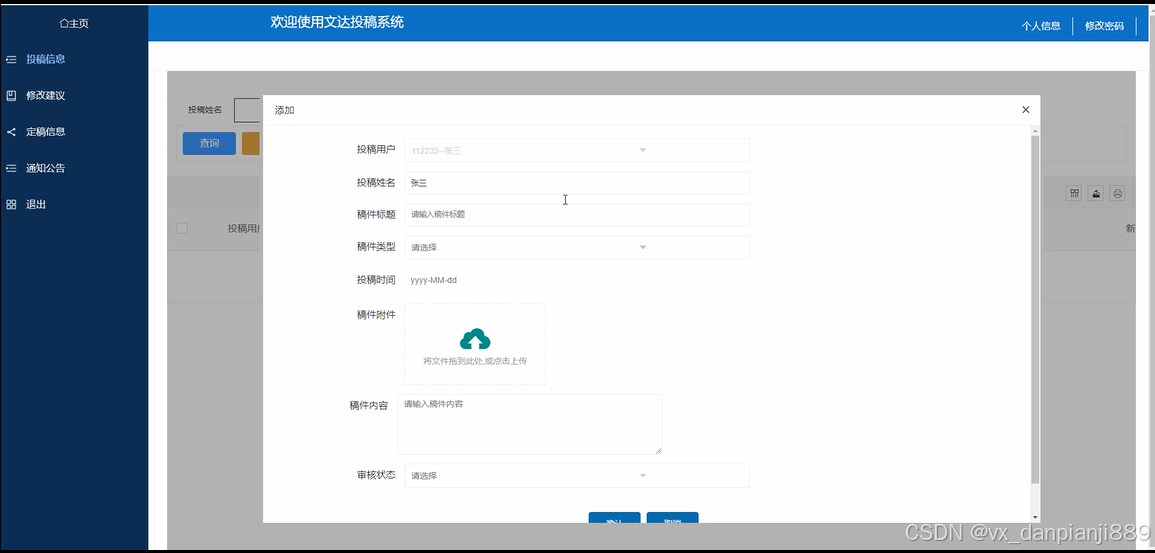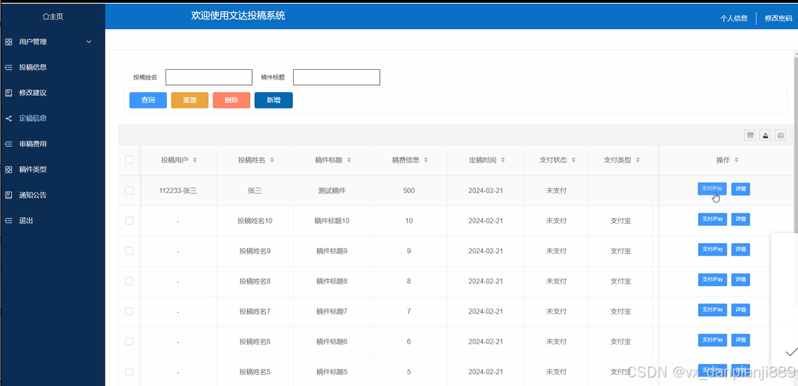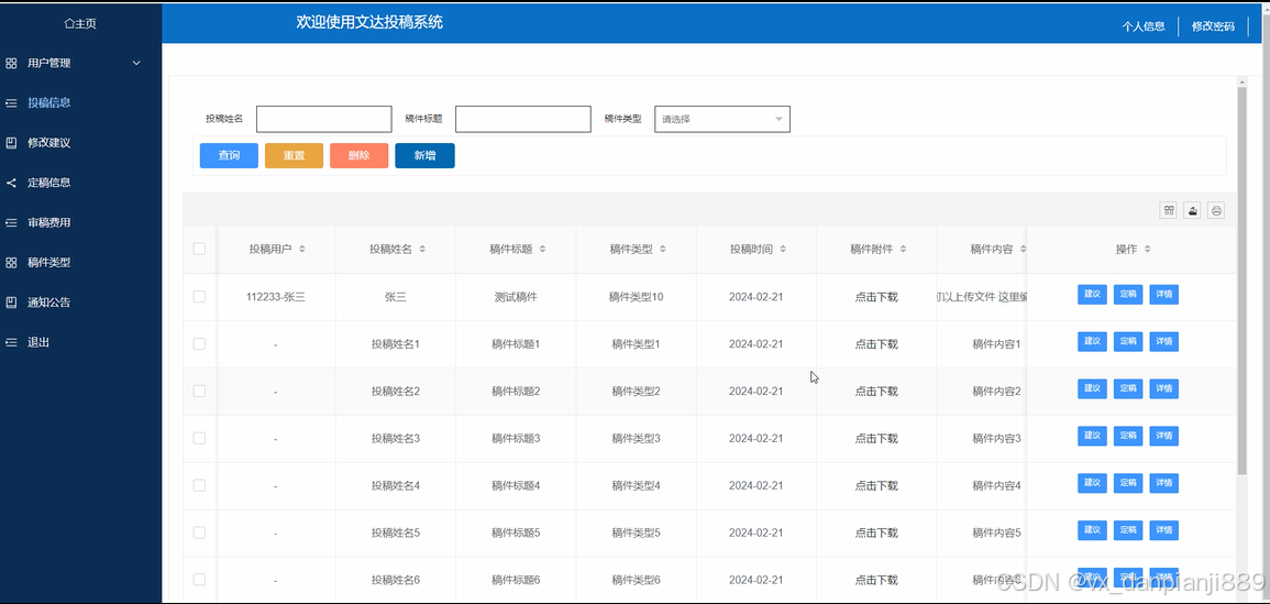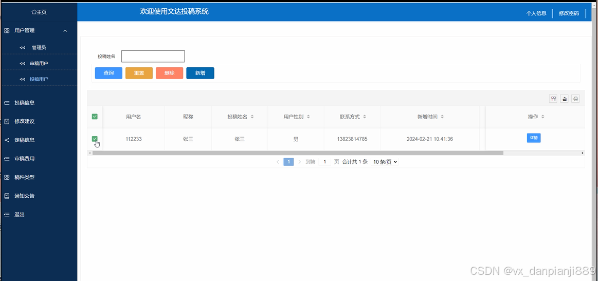 投稿用户点击“投稿信息”菜单按钮,可以对投稿信息进行增删改查等操作,如下图所示。