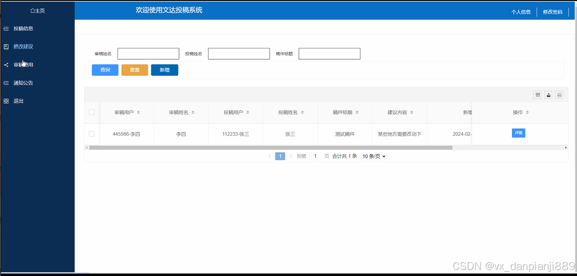 | 点击搜索投稿信息,输入存在的审稿名称名 | 查找出投稿信息 | 与预期结果一致 |