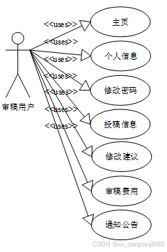 文达投稿系统的功能主要分为投稿用户根据自己的需求进行注册登录,投稿用户可以实现个人信息、修改密码、投稿信息、修改建议、定稿信息、通知公告等功能。审稿用户可以实现主页、投稿信息、修改建议、审稿费用、通知公告等功能。后台系统管理员职责的不同,主要对用户管理、投稿信息、修改建议、定稿信息、审稿费用、稿件类型、通知公告进行处理。