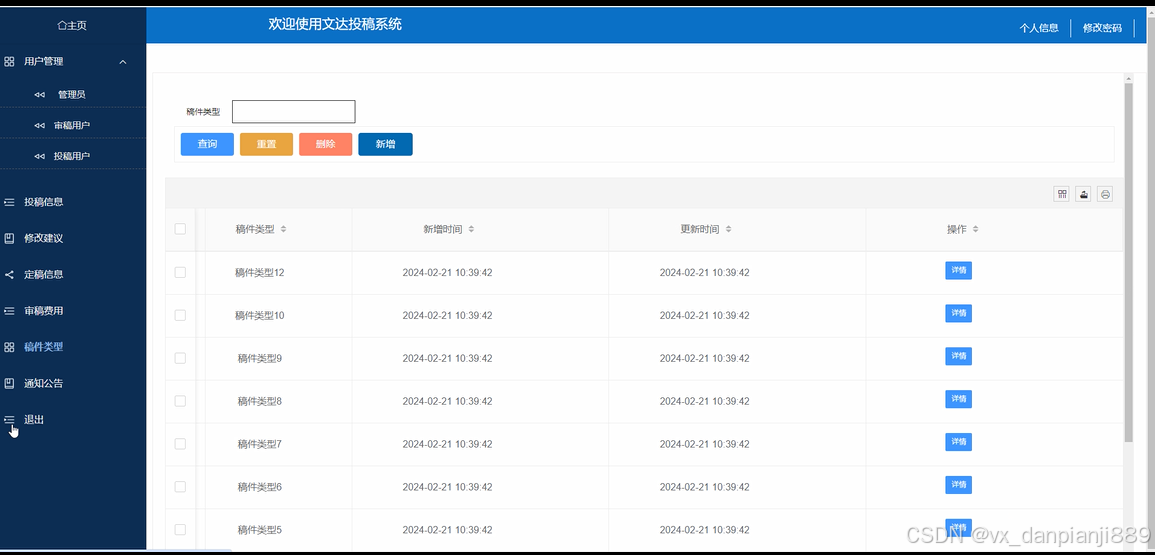 当管理员点击“稿件类型”这一菜单的时候,可以对这稿件类型进行增删改查操作。稿件类型界面如下图所示。