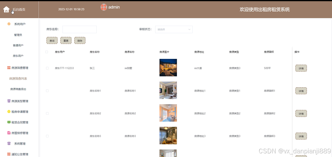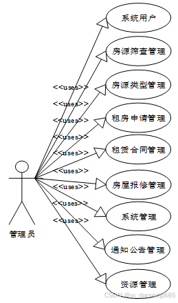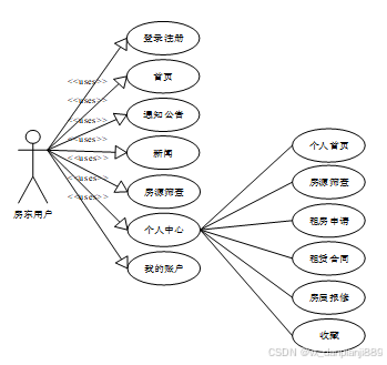 房东用户和管理员可以添加房源信息,管理员负责审核房东提交的房源筛查信息,普通用户可以查看所有的房源信息,管理员对房源筛查信息拥有维护和管理功能。