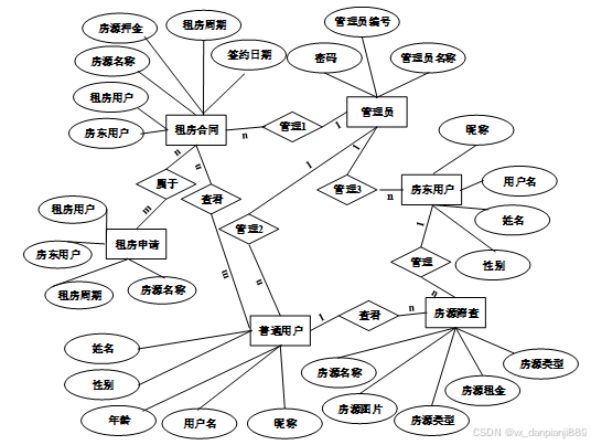 对于一个要开发的系统来说,E-R图可以让别人能更快更轻松的了解此系统的事务及它们之间的关系。根据系统分析阶段所得出的结论确定了在基于springboot的出租房租赁系统中存在着多个实体分别是用教练房东、管理员、普通用户、租房申请、租房合同、房屋报修。