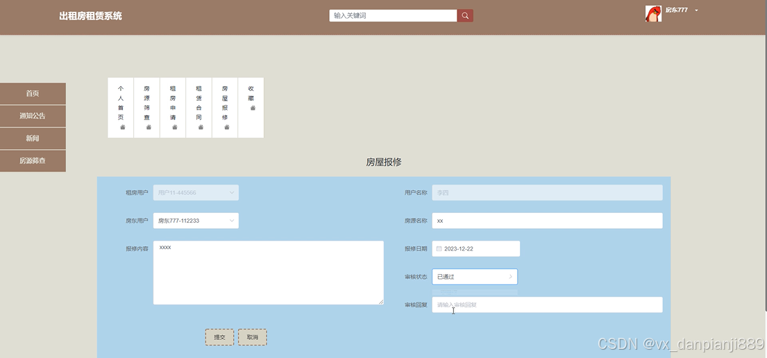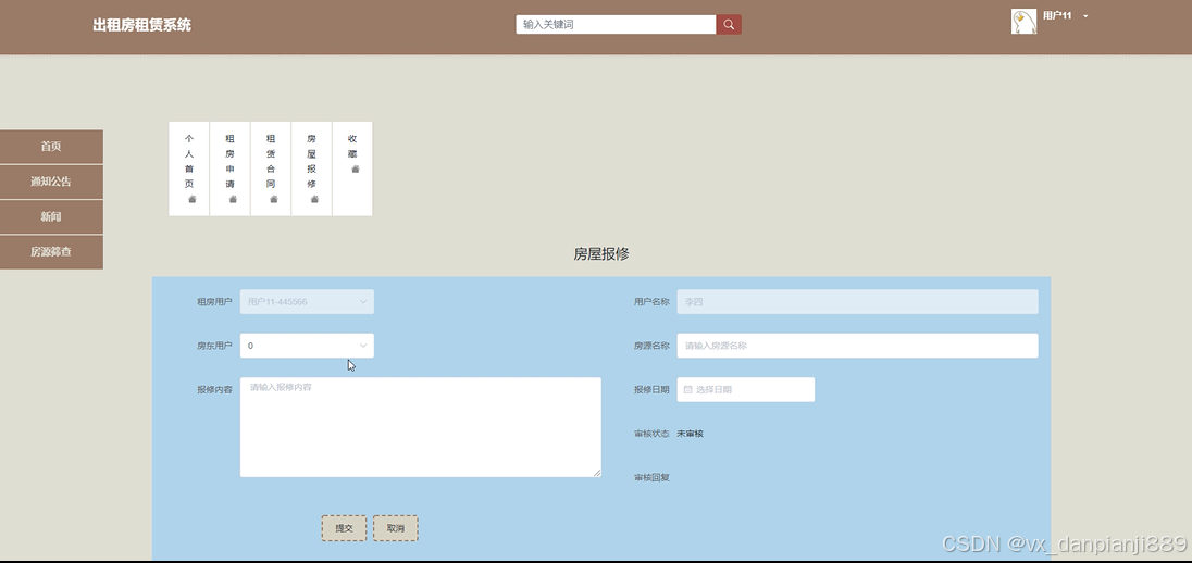 当用户点击右上角个人中心按钮,进入个人中心页面后,当点击"房屋报修"的按钮时,用户可以提交房屋报修信息并可查看审核状态。如下图所示。