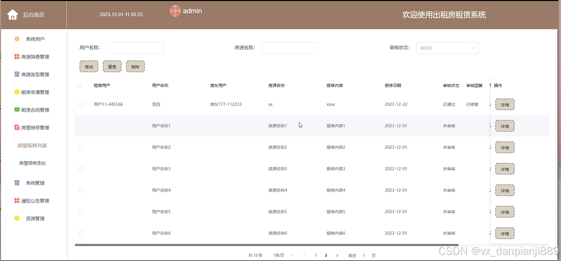 管理员点击“房屋报修管理”这一菜单会显示房屋报修列表、房屋报修添加这两个子菜单,支持输入关键词进行查询,如果想要添加新的房屋报修信息,点击“房屋报修添加”菜单,输入租房用户、用户名称、房东用户、房源名称、报修内容、报修日期、审核状态、审核回复等信息,点击“提交”按钮就可以添加了,同时可以对用户提交的房屋报修信息进行查看详情、删除等操作。界面如下图5-11所示。
