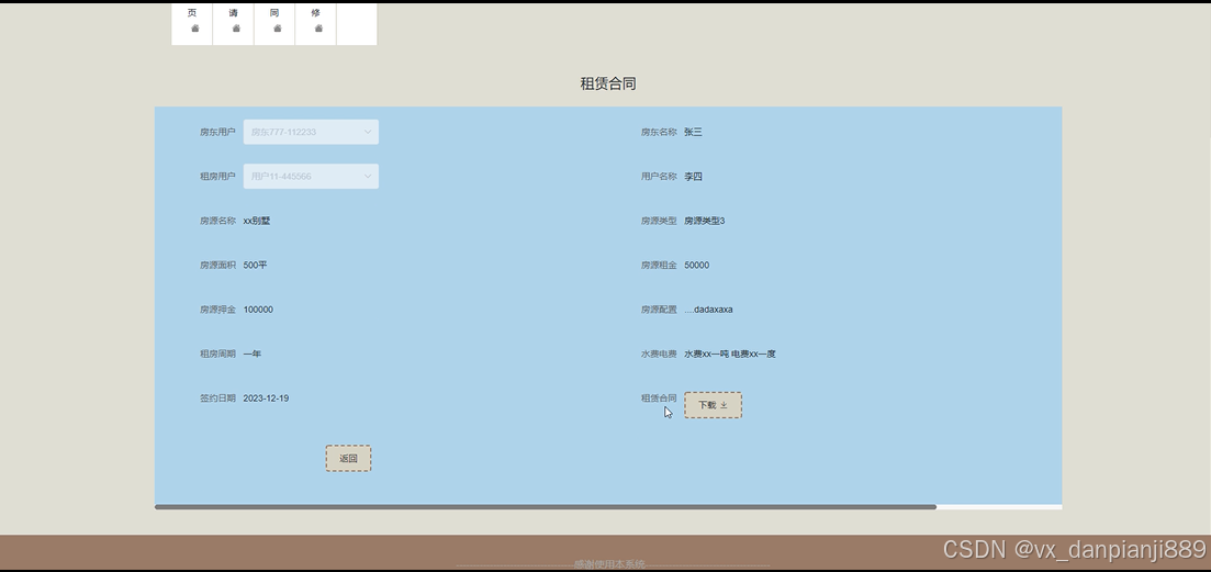 房东录入租赁合同的租房押金、水费电费、租赁日期,上传租赁合同pdf,用户可以查看和下载租房合同,管理员对租赁合同信息拥有维护和管理功能。