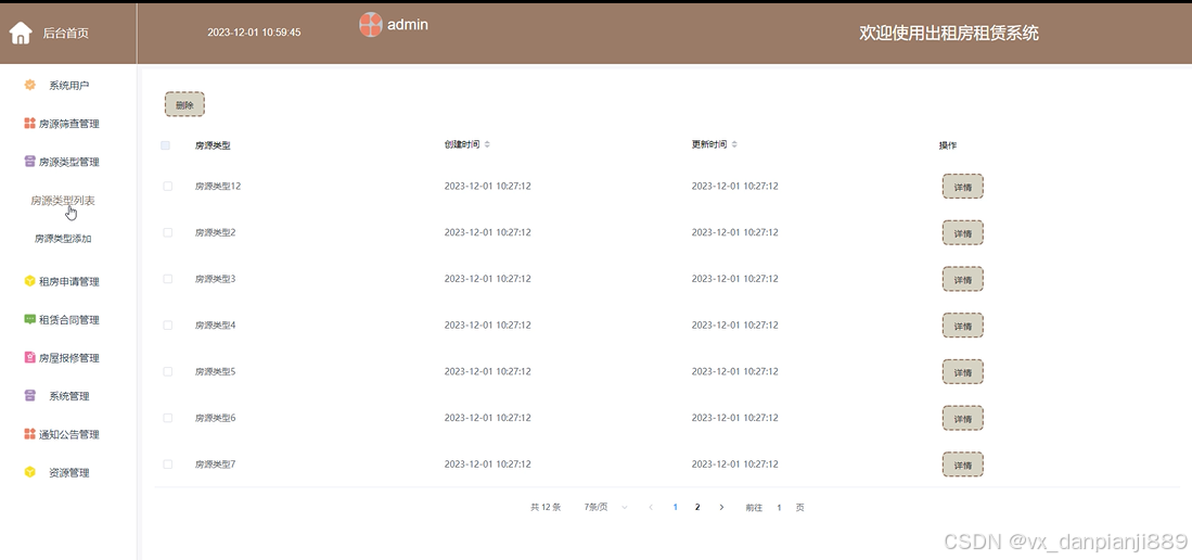 管理员点击“房源类型管理”这一菜单会显示房源类型列表、房源类型添加这两个子菜单,支持输入关键词进行查询,如果想要添加新的房源类型,点击“房源类型添加”菜单,输入房源类型,点击“提交”按钮就可以添加了,同时可以选择某一条房源类型,点击“删除”进行删除。如下图所示。