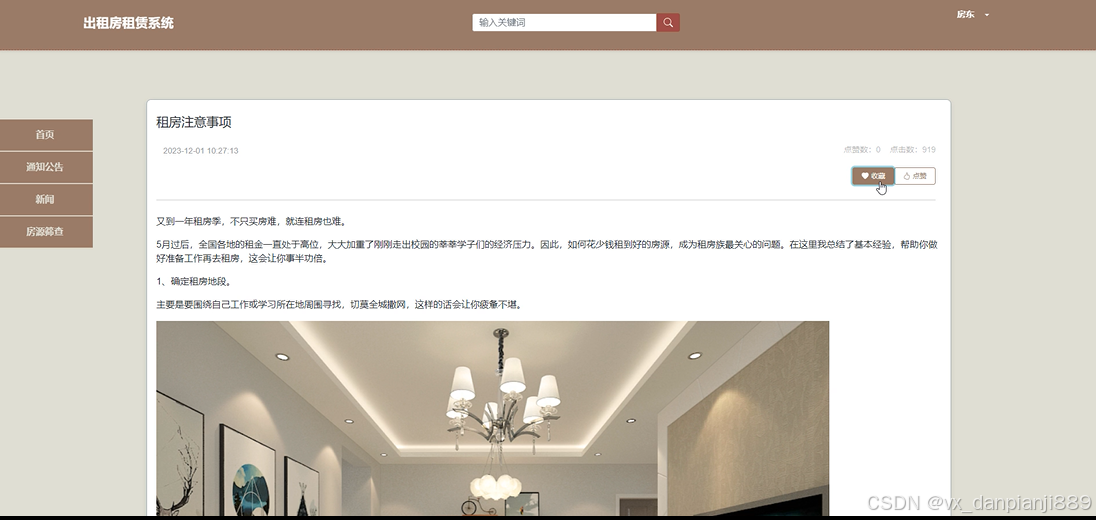 房东点击“新闻”这一菜单,可以查看新闻详情信息,并可进行收藏、点赞、评论等。界面如下图5-16所示。