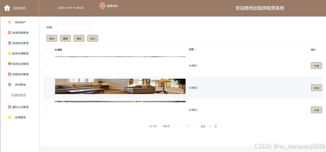 用户点击“轮播图”可以查看到系统中的轮播图信息,管理员如果想要添加新的轮播图,点击“添加”按钮,根据提示输入上轮播图信息,点击“提交”按钮,信息没有错误的话,添加就完成了,如果轮播图信息有误,可以对轮播图更新维护,也可以直接删除某一轮播图