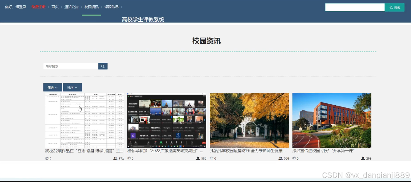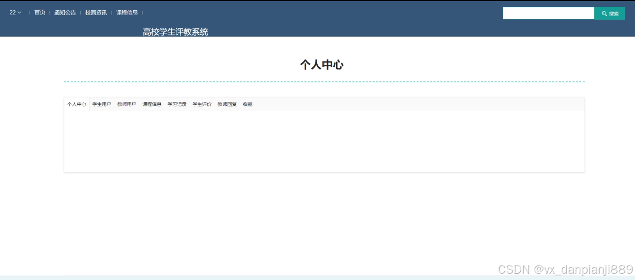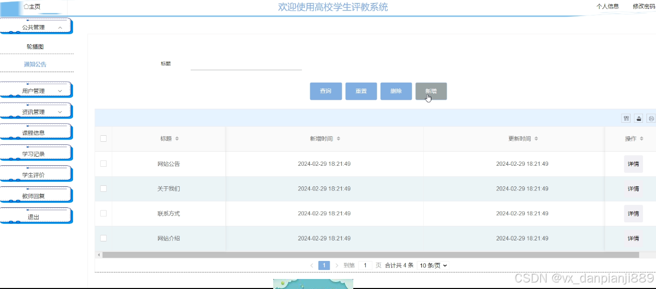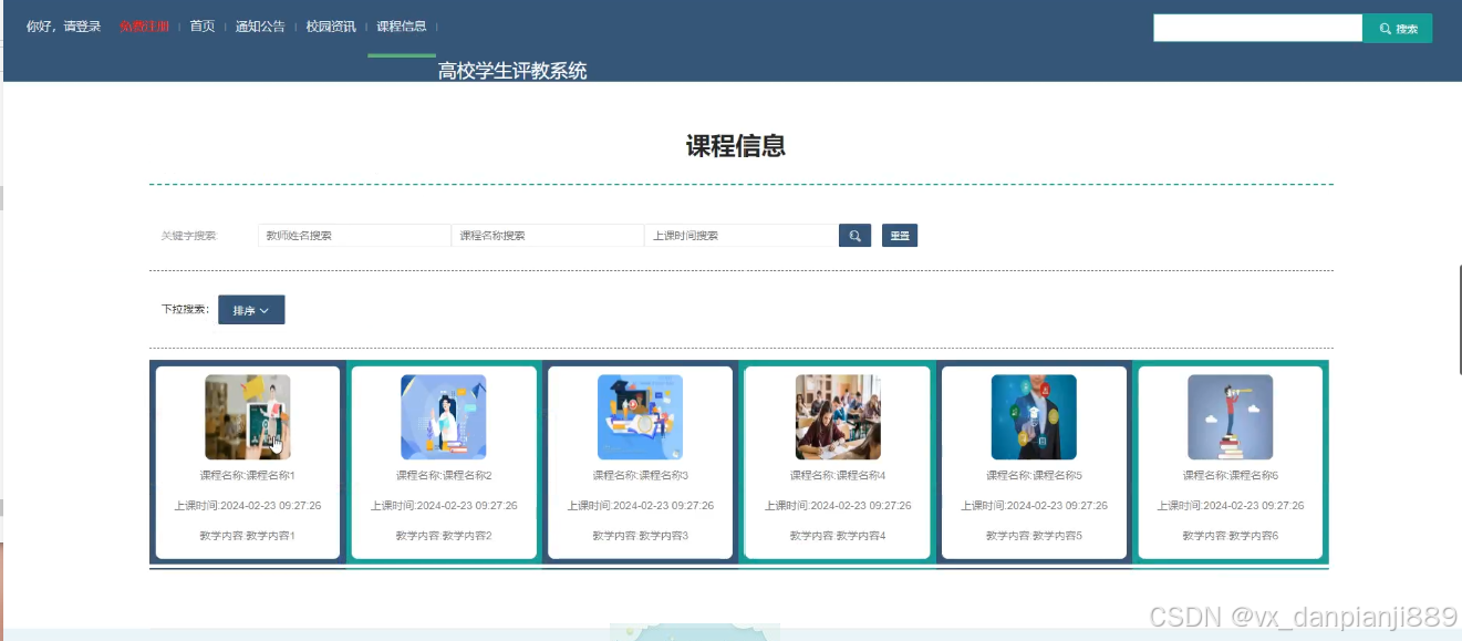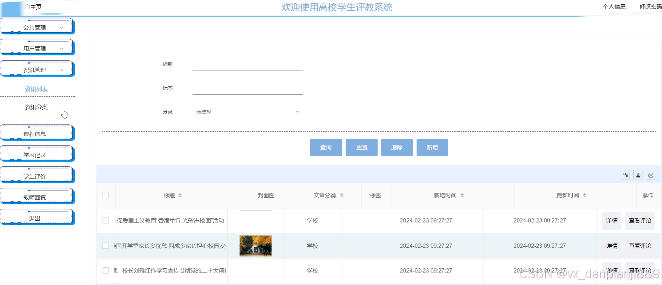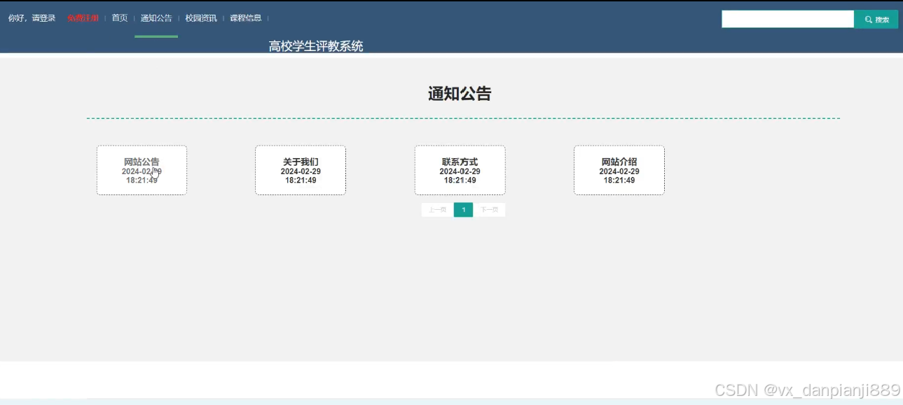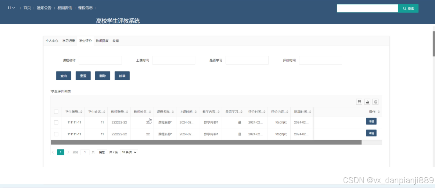 (2)查看高校学生评教系统的首页信息:高校学生评教系统的首页信息包含了首页、通知公告、校园资讯、课程信息等。