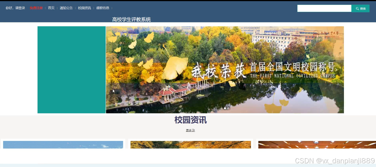 (2)首页:当教师用户进入教师教学质量评价系统的时候,首先映入眼帘的是系统的导航栏,下面是轮播图,再往下是校园资讯、课程信息。