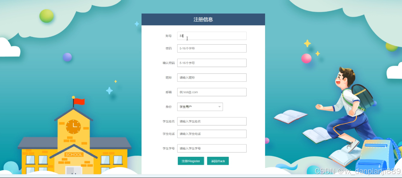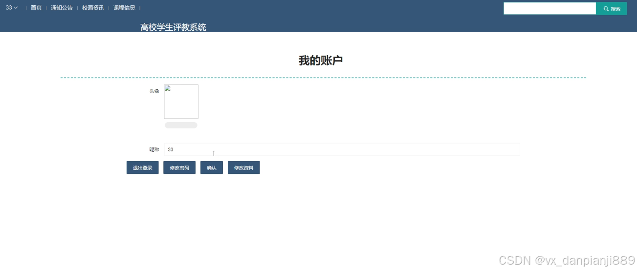 - 注册登录:教师用户通过注册登录系统,可通过点击头像中我的账户,对个人信息进行增删改查。比如个人资料、头像和密码修改。