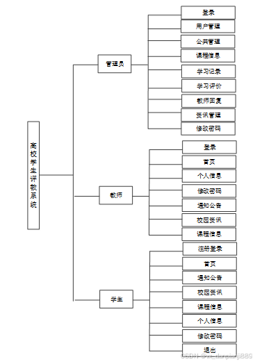高校学生评教系统我划分为了学生用户管理模块、教师用户管理模块和管理员模块这三大部分。