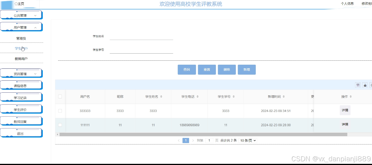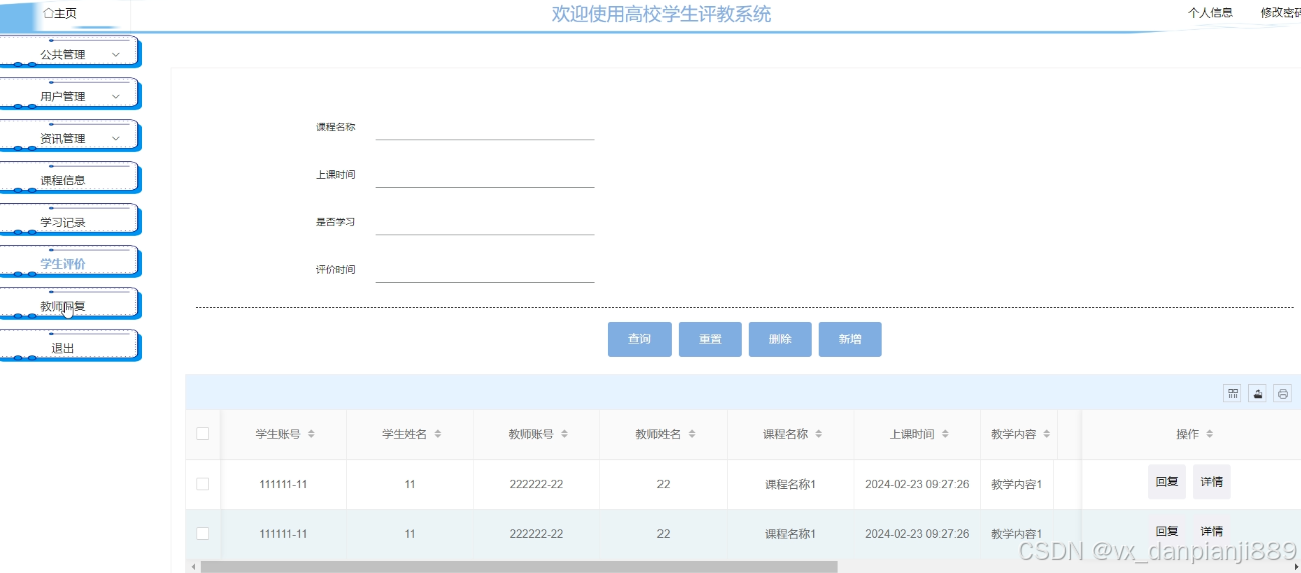 管理员点击“学生评教”会显示出所有的学生评教,支持输入课程名称或者上课时间或者是否学习对评价时间进行查询,也可以点击“删除”进行删除。界面如下图4-12所示。