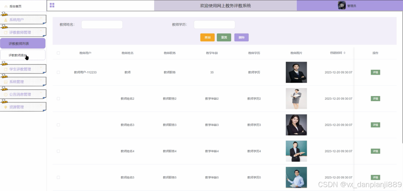 该系统采用B/S架构,使用Python语言和MySQL数据库进行开发,通过浏览器访问,实现了学生对教师的在线评教以及教师对课程的自我评估功能,学生可以通过系统对每位教师的授课质量、教学方法、教材选择等方面进行评价,并提供文字评价和打分。教师则可以在系统中针对自己的课程进行评估,收集学生意见和建议,进而改进教学内容和方式。