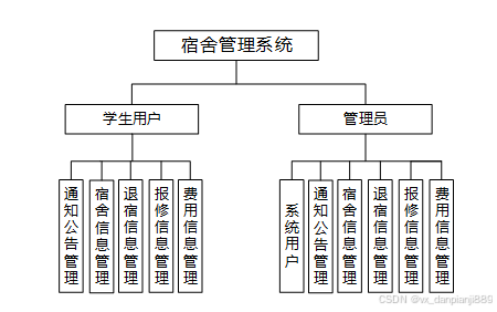 学生宿舍管理系统的主要功能模块分为学生用户模块、宿舍管理模块和管理员模块这三大部分。