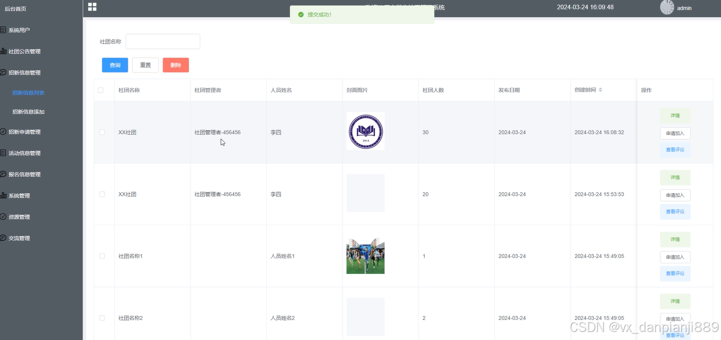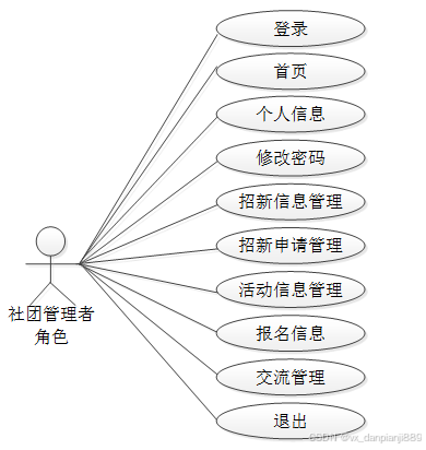 | 主事件流 | (1)管理员进入招新申请管理页面,查询招新申请的信息 (2)管理员可以对招新申请进行增删除和编辑招新申请操作 |