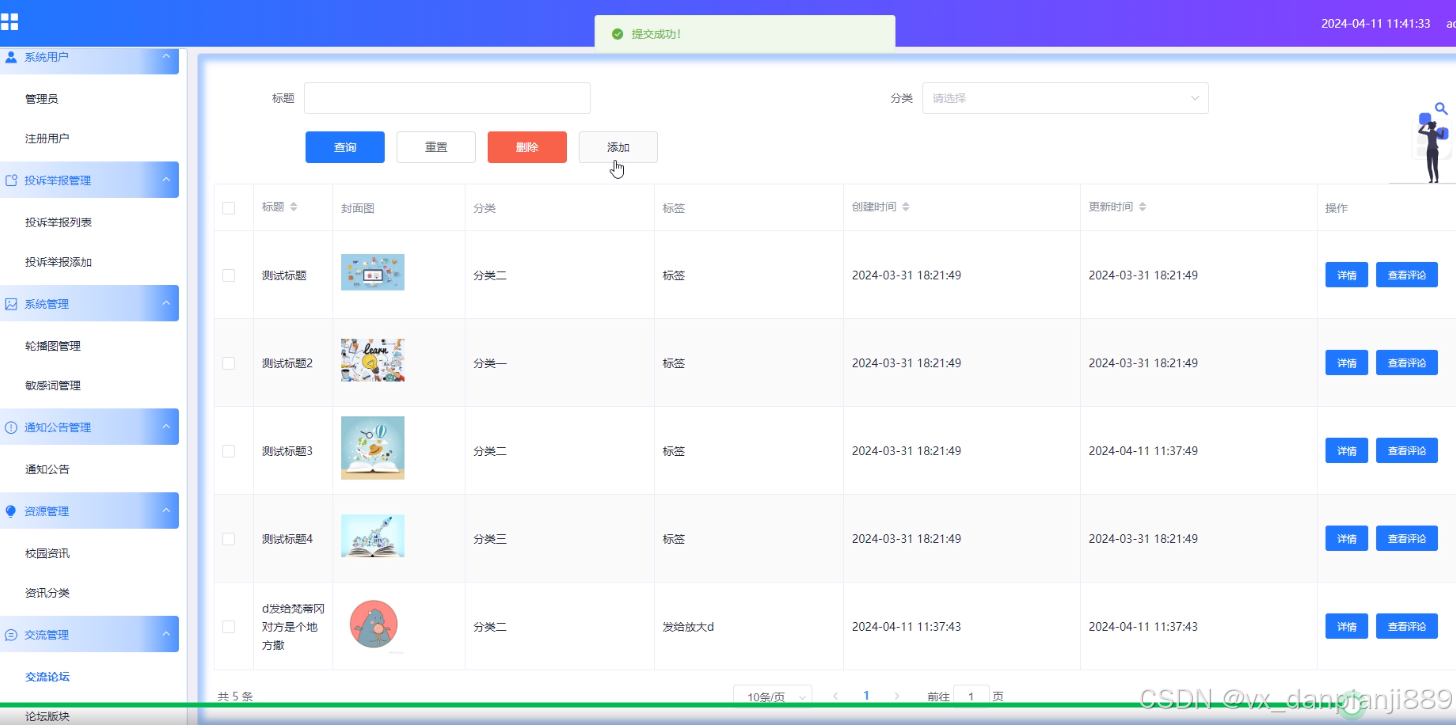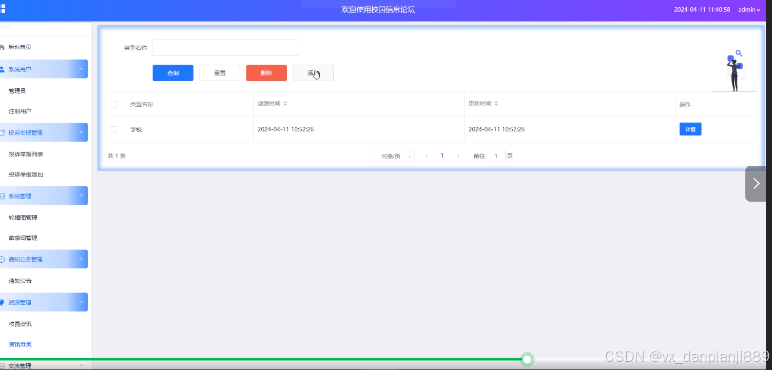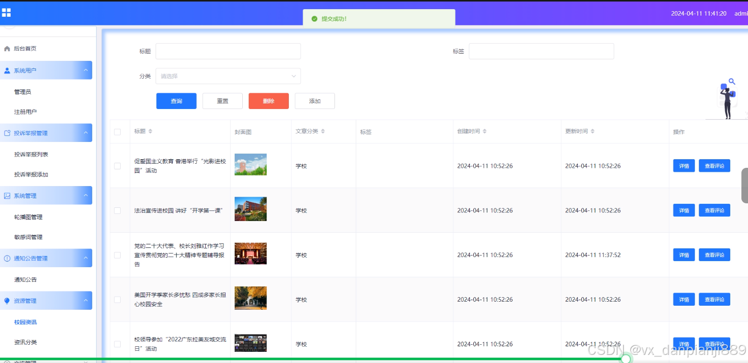 资源管理:允许管理员管理论坛的资讯内容,包括添加新闻、编辑新闻内容、删除新闻等操作,以提供用户更多的校园相关资讯。