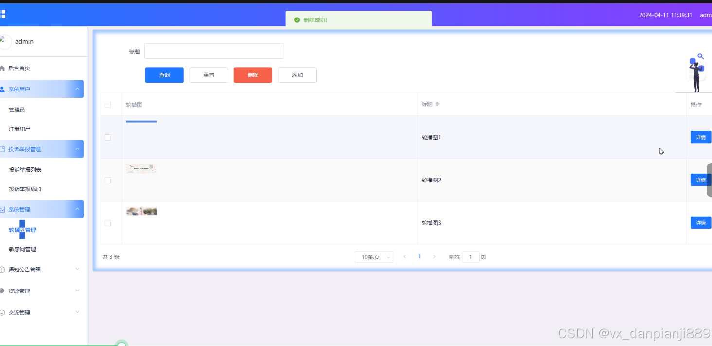 轮播图管理:允许管理员管理论坛首页的轮播图信息,包括添加新轮播图、编辑轮播图信息、删除轮播图等操作,提升论坛的视觉效果和用户体验。