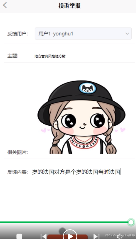 | 测试流程 | 1)搜索查看投诉举报信息,点击投诉举报。 2)填写投诉举报信息,点击进行提交。 |